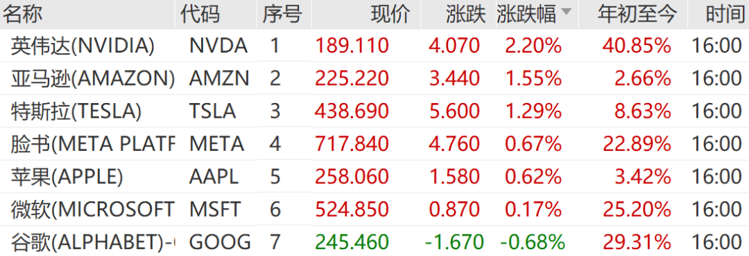 【导读】 标普500指数、纳指创收盘新高; 美联储公布9月议息会议纪要,未来降息路径现 分歧! 中国基金报记者 郭玟君 10月8日,美国三大股指多数收涨,标普500指数、纳指创收盘新高,中概股多数上涨。美国 参议院再次否决两党拨款法案,联邦政府继续停摆。 标普500指数、纳指创收盘新高 美国三大股指多数收涨,道指持平,报46601.78点;标普500指数涨0.58%,报6753.72 点;纳指涨1.12%,报23043.38点。其中, 标普500指数、纳指创收盘新高 。 大型科技股多数上涨,万得美国科技七巨头指数上涨0.84%。英伟达涨2.20%,亚马逊涨 1.55%,特斯拉涨1.29%,领涨美国科技七巨头。 | 涨跌 涨跌幅▼ 年初至今 时间 名称 | 代码 | - 现价 | | | | --- | --- | --- | --- | --- | | 英伟达(NVIDIA) NVDA 1 189.110 4.070 2.20% | | | | 40.85% 16:00 | | 亚马逊(AMAZON) AMZN 2 225.220 | | | 3.440 1.55% | 2.66% 16:00 | | 特斯拉 ...
