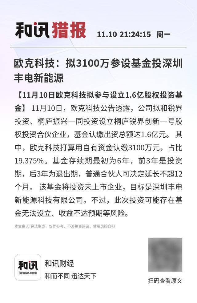 欧克科技:拟3100万参设基金投深圳丰电新能源