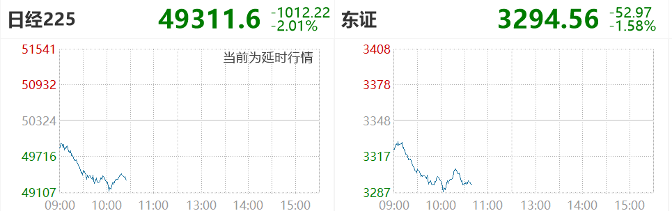 Market Overview - The Asia-Pacific stock markets experienced significant declines, with the Nikkei 225 index dropping over 1000 points, a decrease of 2% [1] - The Tokyo Stock Exchange index fell by more than 1.5% [1] - Notable individual stock movements included Sumitomo Electric Industries down nearly 7% and SoftBank Group down nearly 5% [1][2] Japanese Market Specifics - The 30-year Japanese government bond yield rose by 2.5 basis points to 3.280% [2] - The Japanese yen continued to weaken, with the euro surpassing the 180 yen mark during trading [3] South Korean Market - The KOSPI index in South Korea also fell by 2%, with major companies like SK Hynix and Samsung Electro-Mechanics dropping over 4% [4] - The Hong Kong stock market opened lower, with the Hang Seng Technology Index declining approximately 1.3% [4] Hong Kong Stock Movements - Hong Kong Travel Group saw a significant drop of over 16%, influenced by warnings for Chinese tourists to avoid Japan [4][5] - Other notable declines included Zhong An Group down over 8% and XPeng Motors down nearly 8% [4][5] A-share Market - The A-share market opened lower, with sectors such as aquaculture, precious metals, and glyphosate showing the largest declines [6] - Lithium mining concepts remained strong, with Jin Yuan shares hitting a two-day limit up [6]