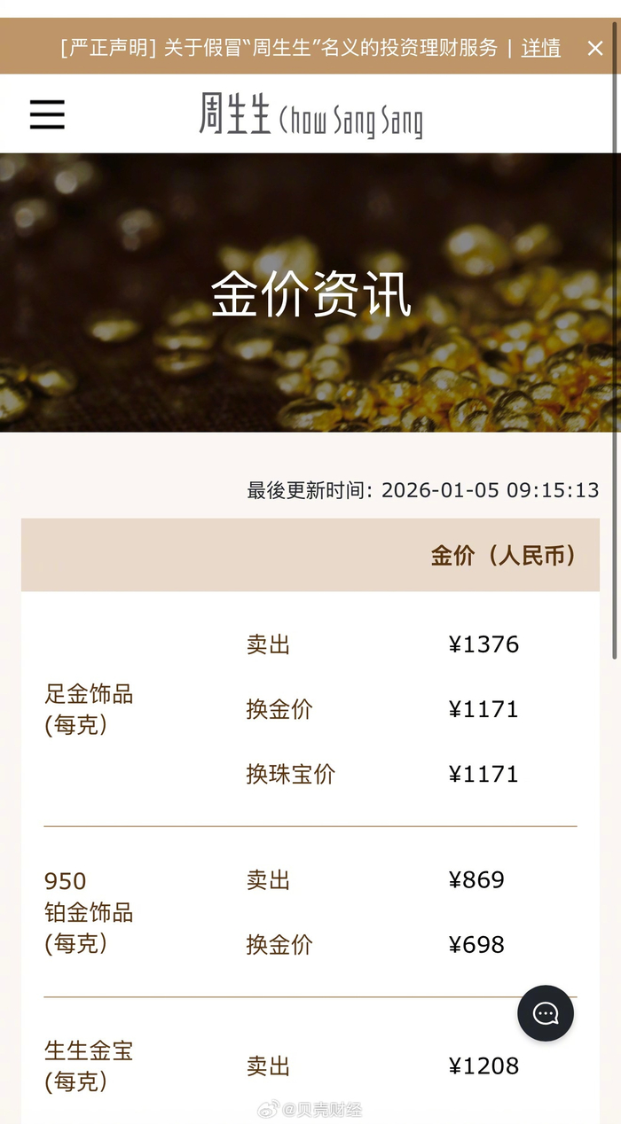 【#金饰价格涨到1376元##金饰价一夜涨22元#】5日早盘,黄金直线拉涨,现货黄金(伦敦金现)再次 站上4400美元。截至发稿,现货黄金涨1.59%,报4400.530美元/盎司;COMEX黄金期货涨1.55%。1月5 日,@中新经纬 查询发现,周生生足金饰品标价1376元/克,较前一日1354元/克的价格上涨22元/克。 老庙黄金足金饰品标价1377元/克,较前一日1356元/克的价格上涨21元/克。 | 950 | 薬品 | *869 | | --- | --- | --- | | 铂金饰品 (每克) | 换金价 | *698 | | 生生金宝 | | | | (每克) | 塗田 | ¥1208 | | | 63 @贝壳财经 | | | | 薬品 | ¥1376 | | --- | --- | --- | | 品 | | | | | 换金价 | ¥1171 | | | 许世中松 | V1171 | ...