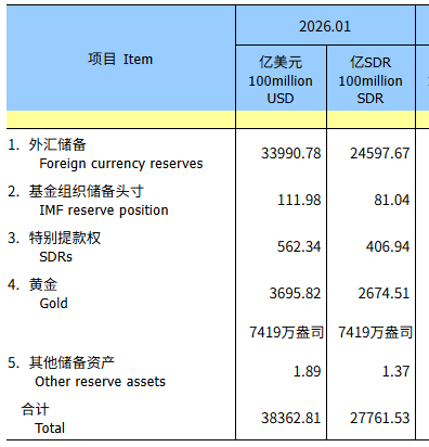 (文章来源:每日经济新闻) | 项目 Item | 2026.01 | | | --- | --- | --- | | | 亿美元 | 亿SDR | | | 100million | 100million | | | USD | SDR | | 1. 外汇储备 | 33990.78 | 24597.67 | | Foreign currency reserves | | | | 2. 基金组织储备头寸 | 111.98 | 81.04 | | IMF reserve position | | | | 3. 特别提款权 | 562.34 | 406.94 | | SDRs | | | | 4. 黄金 | 3695.82 | 2674.51 | | Gold | | | | | 7419万盎司 | 7419万盎司 | | 5. 其他储备资产 | 1.89 | 1.37 | | Other reserve assets | | | | 合计 | 38362.81 | 27761.53 | | Total | | | 每经AI快讯,2月7日,中国人民银行公布数据显示,1月末黄金储备报7419万盎司,2025年12月末 ...