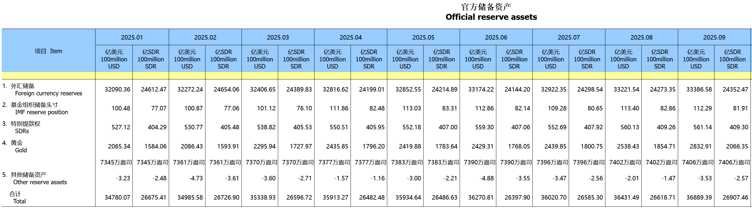 | 项目 Item | 2025.01 | | 2025.02 | | 2025.03 | | | | --- | --- | --- | --- | --- | --- | --- | --- | | | 亿美元 | 亿SDR | 亿美元 | 亿SDR | 亿美元 | 亿SDR | | | | 100million | 100million | 100million | 100million | 100million | 100million | 10 | | | USD | SDR | USD | SDR | USD | SDR | | | 1. 外汇储备 Foreign currency reserves | 32090.36 | 24612.47 | 32272.24 | 24654.06 | 32406.65 | 24389.83 | : | | 2. 基金组织储备头寸 IMF reserve position | 100.48 | 77.07 | 100.87 | 77.06 | 101.12 | 76.10 | | | 3. 特别提款权 SDRs | 527.12 | 404.29 | 530. ...