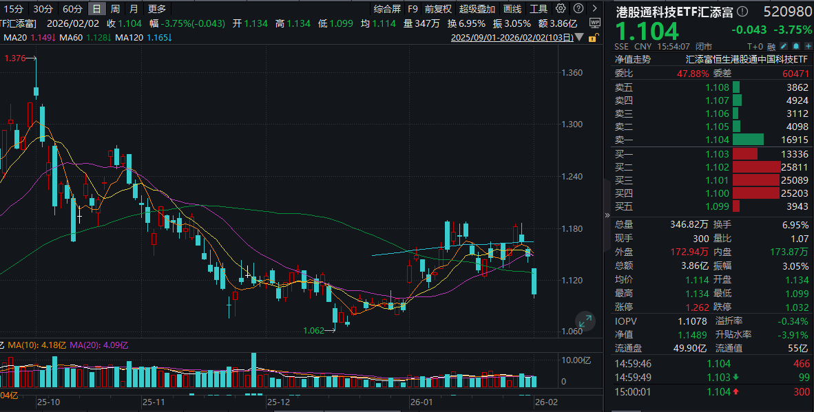 今日(2.2),受市场情绪影响,港股科技再度深度回调,100%纯度的港股通科技ETF汇添富(520980)收跌3.75%,连续第三日大幅下挫,全天成交额近4 亿元! | 序号 | 代码 | 名称 | 估員权車 | 涨跌幅 | 用不不容负 ▼ | | --- | --- | --- | --- | --- | --- | | 1 | 0700 | 腾讯控股 | 7.72% | -1.24% | 166.68 7. | | 2 | 9988 | 阿里巴巴-W | 8.47% | -3.49% | 164.83 Z | | 3 | 0981 | 中本国际 | 8.53% | -4.24% | 70.83 Z | | র্ব | 1810 | 小米集团-W | 6.85% | -1.24% | 64.13 Z | | ਦ | 1211 | 比亚迪股份 | 7.68% | -6.91% | 59.25 亿 | | 6 | 3690 | 美国-W | 7.92% | -2.42% | 51.77 亿 | | 7 | 1347 | 华机半导体 | 2.14% | -11.24% | 48.70亿 | | 8 | 1024 ...