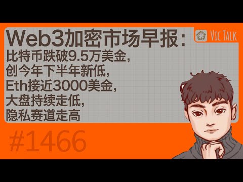 Web3加密市场早报:比特币跌破9.5万美金,创今年下半年新低,Eth接近3000美金,大盘持续走低,隐私赛道走高【Vic TALK 第1466期】