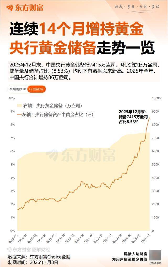 Core Viewpoint - Spot gold has reached a historic high of $4,800 per ounce, with a current price of $4,835.07 per ounce, reflecting a 1.51% increase [2]. Group 1: Gold Price and Market Trends - The increase in geopolitical risks has led both governments and individual investors to allocate more resources to safe-haven assets like gold, suggesting a continued upward trend in gold prices in the medium to long term [2]. - Aakash Doshi, head of gold strategy at State Street Global Advisors, indicates that the possibility of gold prices surpassing $5,000 per ounce by 2026 is becoming more plausible [2]. Group 2: Central Bank Gold Reserves - As of December 2025, China's central bank has increased its gold reserves by 30,000 ounces to a total of 7,415,000 ounces, marking the 14th consecutive month of gold accumulation [3][5]. - The proportion of gold reserves held by China's central bank relative to its foreign exchange reserves has risen to 9.51%, an increase of 3.54 percentage points from the previous year, setting a new historical high, although still below the global average [3]. - The total increase in gold reserves for the year 2025 was 860,000 ounces [3][5].