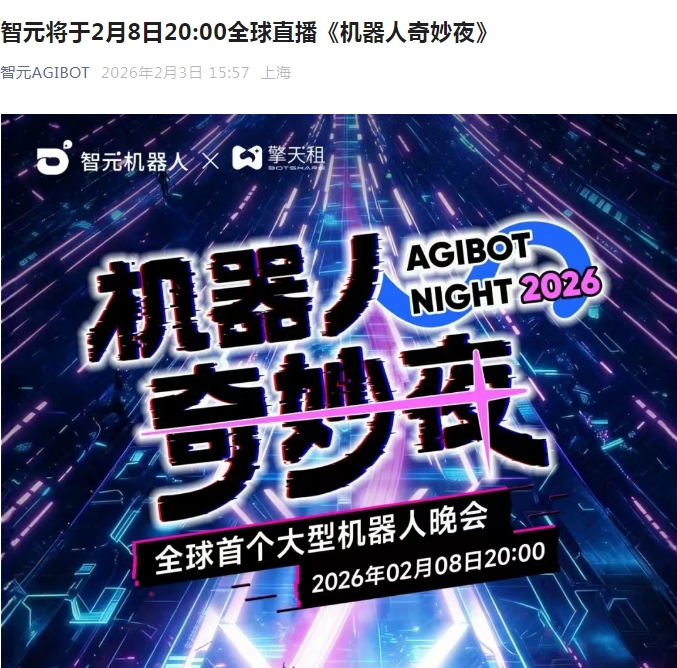 财经频道更多独家策划、专家专栏,免费查阅>> 责任编辑:磐石 全球首个大型机器人晚会来了! 智元机器人官微宣布,将于2月8日20:00全球直播全球首个大型机器人晚会《机器人奇妙夜》。《机器 人奇妙夜》最大亮点在于 "全机器人主导"——两百余台机器人将挑起大梁,包揽整场晚会的表演与观 众互动。 ...