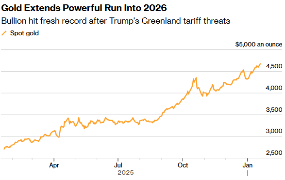 因特朗普总统加码推进收购格陵兰岛计划,引发市场对欧美爆发破坏性贸易战的担忧,国际黄金与白银 价格飙升至历史新高。现货黄金涨幅最高达 2.1%,逼近每盎司 4700 美元;白银涨幅最高达 4.4%。特 朗普的强硬举措令美元承压,同时提振了市场对避险资产的需求。过去 12 个月间,国际金价已累计上 涨约 70%,此番特朗普谋求吞并格陵兰岛引发的相关担忧,进一步为这一轮创纪录涨势注入新动力。 近几周来,地缘政治紧张局势升级,加之针对美联储独立性的抨击再次出现,投资者纷纷涌入黄金交易 市场。 ...