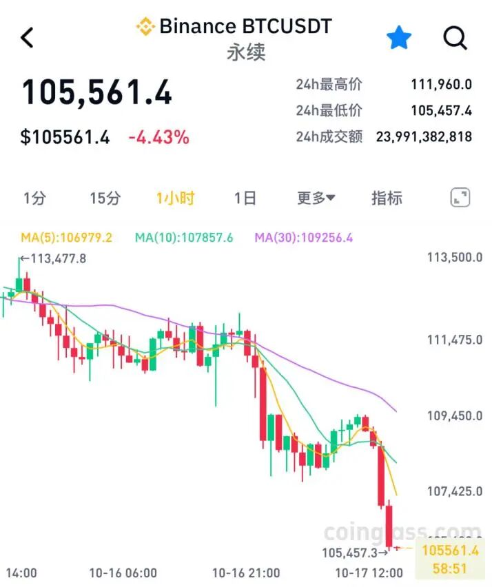 Core Insights - The cryptocurrency market experienced a significant downturn, with Bitcoin dropping below $106,000, currently priced at $105,561.4 per coin [1] - Ethereum fell below $3,800, now at $3,741.75, reflecting a 24-hour decline of 6.32% [3] - Other cryptocurrencies such as SOL, Dogecoin, and BNB also saw declines exceeding 9% [5] Market Performance - Bitcoin (BTC) is currently priced at $105,491, down 4.55%, with a market cap of approximately $71.05 billion, down 1.7% [6] - Ethereum (ETH) is priced at $3,755, down 6.2%, with a market cap of around $44.02 billion, down 5.8% [6] - SOL is priced at $177.7, down 7.87%, with a market cap of about $9.18 billion, down 9.3% [6] - XRP is at $2.237, down 7.14%, with a market cap of approximately $3.66 billion, down 9.7% [6] - BNB is priced at $1,056, down 10.8%, with a market cap of around $1.88 billion, down 9.9% [6] - Dogecoin (DOGE) is at $0.1787, down 9.44%, with a market cap of about $1.81 billion, down 9.8% [6] Liquidation Data - Over the past 24 hours, more than 280,000 traders were liquidated, with total liquidation amounting to $1.04 billion, including $820 million from long positions and $220 million from short positions [6] - Liquidation amounts over different time frames include $200 million in the last hour, $340 million in the last four hours, and $440 million in the last twelve hours [7] Market Sentiment and Analysis - The downturn in the cryptocurrency market is attributed to rising risk aversion due to turmoil in the U.S. credit market, leading to increased expectations for interest rate cuts by the Federal Reserve [8] - Bitcoin's performance has disappointed the market, with significant outflows from Bitcoin spot ETFs totaling $536 million on October 16, with no ETFs reporting net inflows [8] - Analysts suggest that the recent market correction and large-scale liquidations may be driven by native cryptocurrency investors rather than institutional or retail ETF holders [8] - A critical support level for Bitcoin is identified at $107,000, with potential for deeper declines if this level is breached [8]