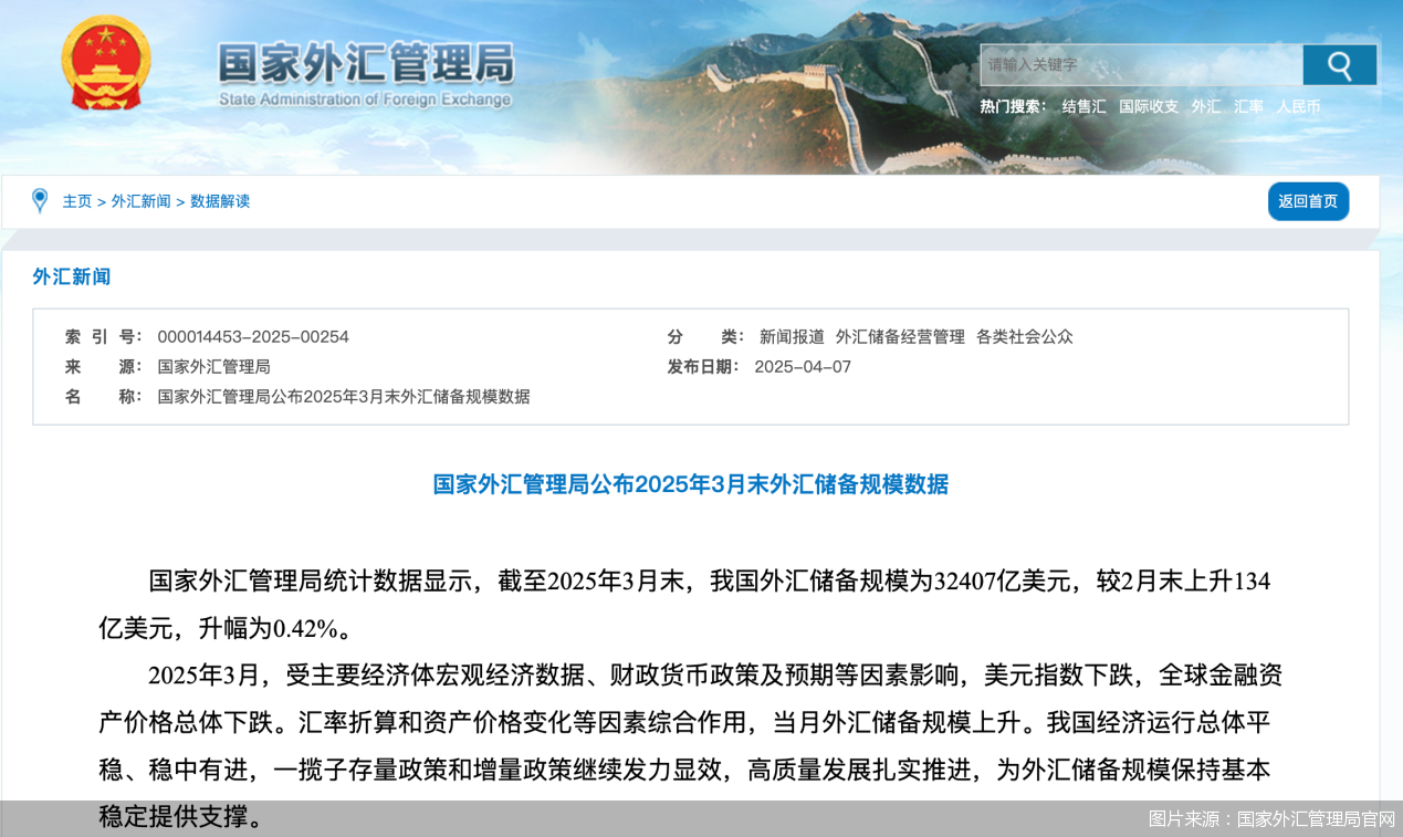 最新一期外汇储备数据出炉。4月7日,国家外汇管理局统计数据显示,截至2025年3月末,我国外汇储备规模为32407亿美元,连续16个月保持在3.2万亿美 元关口上方。汇率折算和资产价格变化等因素综合作用下,当月外汇储备规模上升。 另据央行官网更新的官方储备资产数据,截至2025年3月末,我国黄金储备7370万盎司,较2月末增长9万盎司。面对金融市场的动荡,有分析人士指出,央 行继续稳健地增持黄金,更多是出于应对地缘政治新风险点和不确定性、顺应市场避险情绪、对冲其他类别金融资产波动性的考虑。 中信证券首席经济学家明明在接受北京商报记者采访时指出,2025年3月,受主要经济体宏观经济数据、财政货币政策及预期等因素影响,美元指数下跌, 全球金融资产价格总体下跌。截至3月28日,在岸人民币汇率为1美元对7.2637元人民币,离岸人民币汇率为1美元对7.2697元人民币,较2月末分别升值 0.28%和0.35%。汇率折算和资产价格变化等因素综合作用下,当月外汇储备规模上升。 黄金储备"五连增" 4月7日,受到美国"对等关税"政策影响,全球金融市场一片震荡,黄金价格波动加剧。央行在黄金储备方面的动作,也受到更多关注。 外 ...