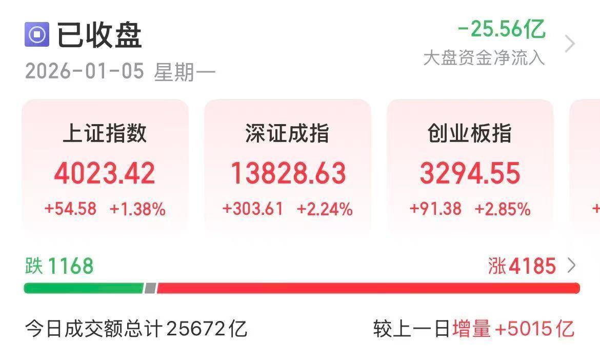 1月5日(2026年首个交易日),A股市场迎"开门红",上证指数、深证成指、创业板指、科创50指数全 天震荡走强,上证指数再度收复4000点。截至收盘,上证指数报4023.42点,涨1.38%,成交额10673亿 元;深证成指报13828.63点,涨2.24%,成交额14790.13亿元;创业板指报3294.55点,涨2.85%,成交额 7020.61亿元;科创50指数报1403.41点,涨4.41%,成交额812亿元。沪深两市合计成交25463.13亿元, 成交额较上一交易日增加5010.9亿元。 传媒、医药生物等行业走强锋龙股份7连板 涨停股中,从连续涨停天数来看,大于或等于2天的个股有19只。其中,锋龙股份7连板,连续涨停板数 量最多;雷科防务4连板;*ST东易、友邦吊顶、南兴股份均3连板;农心科技、利欧股份、北斗星通、 王子新材、索菱股份、顺控发展、蓝色光标、城建发展等14股均2连板。 沪深两市主力资金净流出62.98亿元 12个行业主力资金呈现净流入 Wind统计显示,沪深两市主力资金今日净流出62.98亿元;其中,创业板主力资金净流入14.97亿元;沪 深300成份股主力资金净流入39.99 亿元 ...