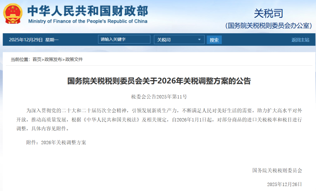 我国关税重大调整,2026年1月1日起实施