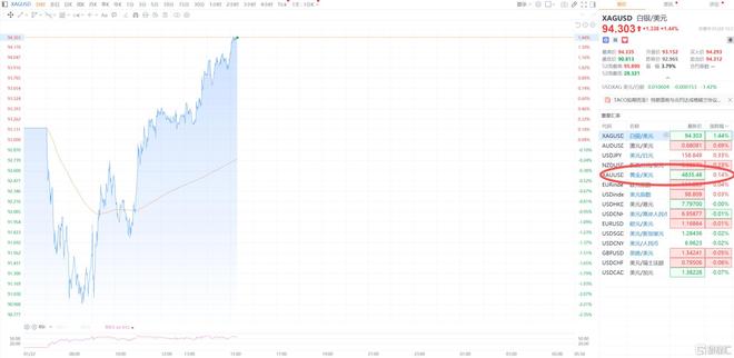 日前,特朗普除了不留情面地"训话"欧洲外,还上演了"格陵兰TACO":不动武,税也不加了。 这引人瞠目的180度大反转后,全球避险情绪降温,金银价格应声走低。 周四亚市早盘,现货黄金一度跌破4800,现货白银最低回落至90美元/盎司附近。 不过午后,金银价格便再度快速拉升。 现货白银日内涨超1.4%,现报94.263美元/盎司;现货黄金也跌幅收窄,目前已经翻红重上4830美元/盎 司上方。 特朗普"格陵兰TACO" 川普"大闹"达沃斯,短暂冷却了金银的火热势头。 譬如,批评加拿大总理卡尼、嘲讽法国总统马克龙;怒骂丹麦忘恩负义,扬言没美国欧洲得说德语甚至 是日语…… 特朗普还主动cue到了欧洲"爸爸梗"。 他称,此前北约一直都"爱"他,还叫他"爸爸",现在要一块领土不过分吧? 一番口嗨后,特朗普突然又上演"格陵兰TACO"。 他180度大反转改口宣布:"不动武夺岛,不对欧洲8国加征关税"。 据称,特朗普与北约秘书长吕特会晤后称,双方已就格陵兰岛及北极安全达成初步协议框架。 其中涉及美国在格陵兰的军事基地、矿产开发优先拒绝权等,但具体细节未公开。 地缘冲突恐慌蔓延之际,全球都在紧盯特朗普达沃斯演讲。 果然,川普的 ...