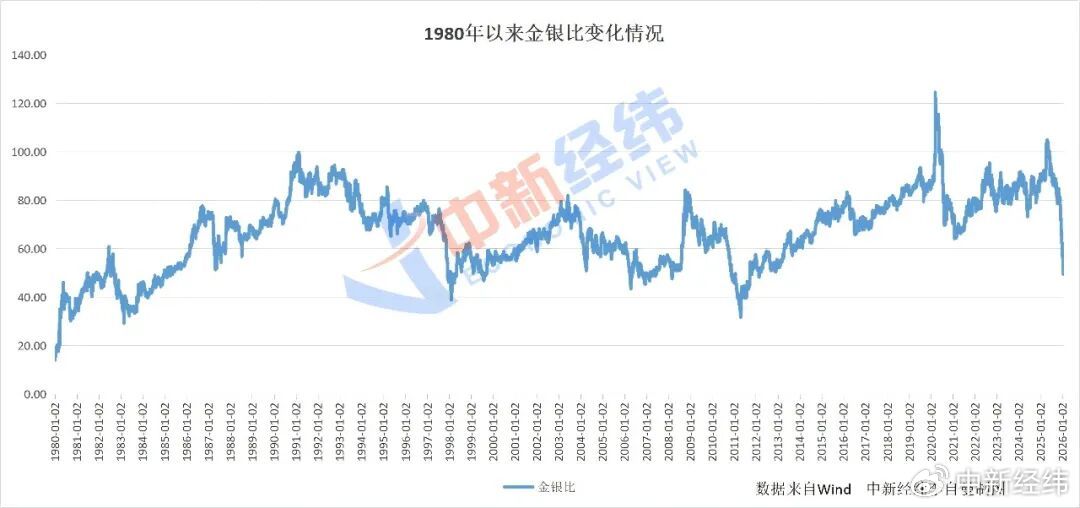 金银比创近14年新低 金银比是一项衡量黄金与白银这两种贵金属相对价格强弱的指标。它表示购买一盎司黄金需要多少盎司的白银。数值越高,说明白银相对黄金越"便宜"; 数值越低,则说明白银相对黄金越"贵"。 来源:@中新经纬微博 2026年开年以来,黄金、白银价格持续冲高,截至22日发稿前,现货黄金涨幅约12%,现货白银涨幅约31.52%。 伴随白银强势上涨,近期,金银比一度跌破50,引发了市场广泛关注。何为金银比?这个比值跌破50到底意味着什么? jwview 金银比是判断白银相对黄金估值高低,以及市场情绪在避险与增长之间切换的重要参考工具。计算公式为:金银比=黄金价格/白银价格(单位:美元/盎 司)。 例如,截至22日发稿前,现货黄金最高报4839.353美元/盎司,现货白银报94.391美元/盎司,金银比约为51.27。 20世纪70年代,布雷顿森林体系(二战后建立的国际货币金融体系)崩溃后,金银价格自由浮动,金银比值开始大幅波动。Wind显示,过去五十年来, 该比值主要在30到100之间宽幅震荡。 Wind数据显示,1980年1月,金银比跌至14,为20世纪以来最低水平之一。这一极低比值出现在全球性贵金属牛市 ...
