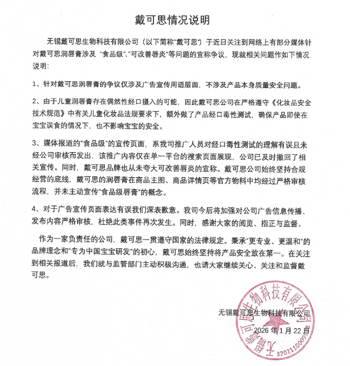 每经AI快讯,1月23日,戴可思发布《情况说明》称,无锡戴可思生物科技有限公司(简称"戴可思") 于近日关注到网络上有部分媒体针对戴可思润唇膏涉及"食品级"、"可改善唇炎"等问题的宣称争议,现 就相关问题作如下情况说明: 针对戴可思润唇膏的争议仅涉及广告宣传用语层面,不涉及产品本身质量安全问题。 由于儿童润唇膏存在偶然性经口摄入的可能,因此戴可思公司在严格遵守《化妆品安全技术规范》中有 关儿童化妆品法规要求下,额外做了产品经口毒性测试,确保产品即使在宝宝误食的情况下,也不影响 宝宝的安全。 媒体报道的"食品级"的宣传页面,系我司推广人员对经口毒性测试的理解有误且未经公司审核而发出, 该推广内容仅在单一平台的搜索页面展现,公司已及时撤回了相关宣传。同时,戴可思品牌也从未夸大 可改善唇炎的宣称。戴可思公司始终坚持合规经营的底线,戴可思的润唇膏在商品主图、商品详情页等 官方物料中均经过严格审核流程,并未主动宣传"食品级唇膏"的概念。 对于广告宣传页面表达有误我们深表歉意。我司今后将加强对公司广告信息传播、发布内容严格审核, 杜绝此类事件再次发生。同时,感谢大家的阅览、指正与监督。 戴可思情况说明 4、对于广告宣传页 ...