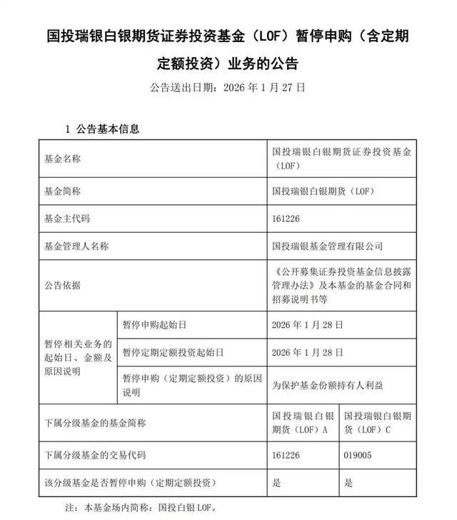 1月26日晚间,国投白银LOF(161226)公告,将于2026年1月28日起暂停申购(含定期定额投资)业 务。 | 基金名称 | | 国投瑞银白银期货证券投资基金 (LOF) | | --- | --- | --- | | 基金简称 | | 国投瑞银白银期货(LOF) | | 基金主代码 | | 161226 | | 基金管理人名称 | | 国投瑞银基金管理有限公司 | | 公告依据 | | 《公开募集证券投资基金信息技露 | | | | 管理办法》及本基金的基金合同和 | | | | 招募说明书等 | | 暂停相关业务的 | 暂停申购起始日 | 2026年1月28日 | | 起始日、金额及 | 暂停定期定额投资起始日 | 2026年1月28日 | | 原因说明 | 暂停申购(定期定额投资)的原因 | 为保护基金份额持有人利益 | | 说明 | | | | 下属分级基金的基金简称 | | 国投瑞银白银 国投瑞银白银期 | | | | 期货(LOF) A 货(LOF)C | | 下属分级基金的交易代码 | | 019005 161226 | | 该分级基金是否暂停申购(定期定额投资) | | 是 是 | 该基 ...