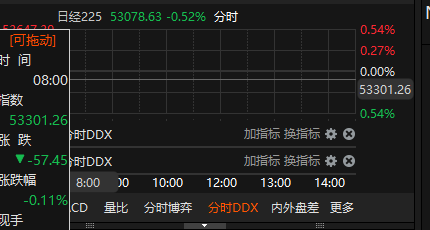 日经225指数向下跌破53000点,日内下跌1.87%