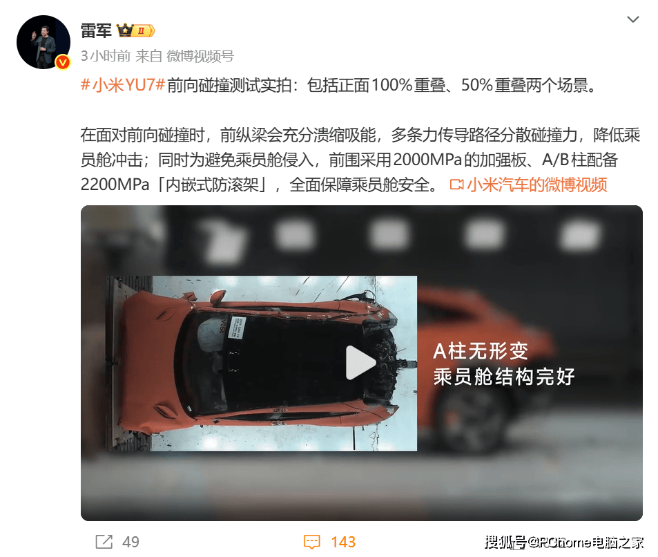 11月14日,小米创办人,董事长兼CEO雷军在社交媒体平台发布了小米YU7前向碰撞测试实拍的视频,其中包括正面100%重叠、50%重叠两个场景。 据视频中官方介绍:"在面对前向碰撞时:前纵梁会充分溃缩吸能,多条力传导路径分散碰撞力,降低乘员舱冲击;同时为避免乘员舱侵入,前围采用 2000MPa的加强板、A/B柱配备2200MPa'内嵌式防滚架',全面保障乘员舱安全。"小米汽车在视频中表示,安全是前提,安全是基础,安全是一切。 据了解,小米YU7是小米旗下中大型纯电SUV,售价25.35-32.99万元,提供后驱与双电机四驱版本。 车身轴距达3000mm,5门5座布局搭配1970L最大储物 容积,主副驾零重力座椅、36处收纳位等设计兼顾舒适与实用。续航补能表现亮眼,后驱版CLTC续航820km,支持5分钟补能400km的兆瓦闪充。 智能配置 拉满,搭载骁龙8芯片与英伟达Thor计算平台,标配激光雷达及多传感器,支持高阶辅助驾驶。 ...