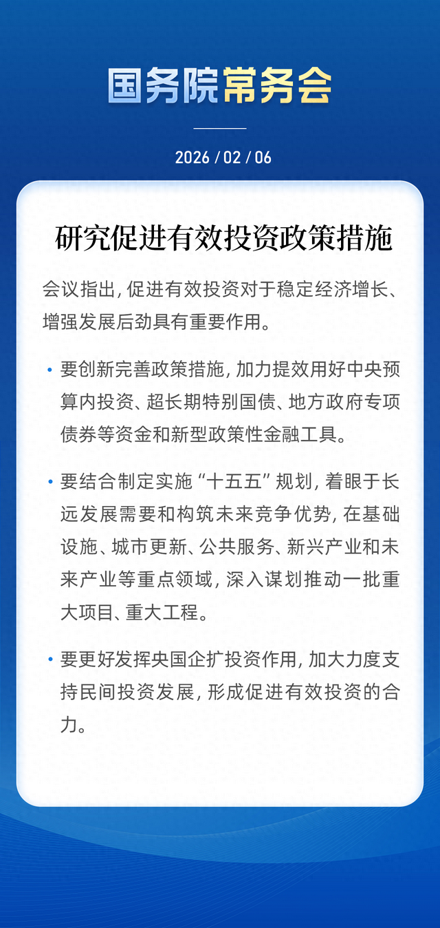 投资一直是拉动经济增长的重要手段。 2月6日,国务院常务会议研究促进有效投资政策措施,明确要创新完善政策措施,加力提效用好中央预 算内投资、超长期特别国债、地方政府专项债券等资金和新型政策性金融工具。在基础设施、城市更 新、公共服务、新兴产业和未来产业等重点领域,深入谋划推动一批重大项目、重大工程。 新年伊始,高层就对有效投资工作作出系统部署,会议传递出通过高质量投资稳增长、增后劲的清晰信 号。 国务院常务会议此时研究促进有效投资,具有特殊意义。 2026年是"十五五"规划开局之年,这既是为五年发展蓝图提供关键"启动引擎",也是应对当前经济形 势、夯实增长基础的关键之年。 投资是拉动经济增长的"三驾马车"之一,在扩内需、促发展中仍然发挥着关键性作用。 会议明确提出"促进有效投资对于稳定经济增长、增强发展后劲具有重要作用",这一表述将有效投资置 于经济工作的重要位置。与以往相比,此次会议对投资工作的定位更加明确。 2025年年末召开的中央经济工作会议提出要"推动投资止跌回稳",提出"适当增加中央预算内投资规 模""继续发挥新型政策性金融工具作用"。 此次会议亮出了中央预算内投资、超长期特别国债、地方政府专项债券 ...