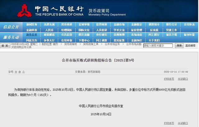 为保持银行体系流动性充裕,2025年10月15日,中国人民银行将以固定数量、利率招标、多重价位中标 方式开展6000亿元买断式逆回购操作,期限为6个月(182天)。 | | | 中国人民视行 THE PEOPLE'S BANK OF CHINA | | 货币政策司 Monetary Policy Department | | | | | | | --- | --- | --- | --- | --- | --- | --- | --- | --- | --- | | 信息公开 | 新闻发布 | 不排不断 炭而改变 | | 宏观审位 信频改策 | 金融市场 | 全融动态 | 加查按计 | 银行会计 | 支付休系 | | 金融科技 | | 人民币 | 经理国际 | 围辉交住 人员招录 | 学术交流 | 征值管理 | 反洗钱 | 党建工作 | | | 服务互动 | 最普公开 阿瑟文告 | 政策解读 办事大厅 | 公告信息 在线申报 | 脚文 ( 央行研究 下载中心 阿上调查 | 置换限频 重期管理 | 市场动态 全融知识 | SHERT 关于我们 | 据备下载 | 报时年级 | | 2025年10月14日 星期二 ...