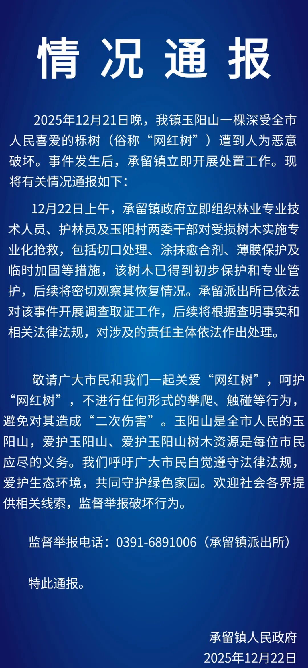 12月22日上午,承留镇政府立即组织林业专业技术人员、护林员及玉阳村两委干部对受损树木实施专业化抢救,包括切口处理、涂抹愈合剂、薄膜保护及 临时加固等措施,该树木已得到初步保护和专业管护,后续将密切观察其恢复情况。承留派出所已依法对该事件开展调查取证工作,后续将根据查明事实 和相关法律法规,对涉及的责任主体依法作出处理。 敬请广大市民和我们一起关爱"网红树",呵护"网红树",不进行任何形式的攀爬、触碰等行为,避免对其造成"二次伤害"。玉阳山是全市人民的玉阳山, 爱护玉阳山、爱护玉阳山树木资源是每位市民应尽的义务。我们呼吁广大市民自觉遵守法律法规,爱护生态环境,共同守护绿色家园。欢迎社会各界提供 相关线索,监督举报破坏行为。 来源:九派新闻 监督举报电话: 0391-6891006 (承留镇派出所) 12月22日,河南济源市承留镇人民政府发布情况通报。 2025年12月21日晚,我镇玉阳山一棵深受全市人民喜爱的栎树(俗称"网红树")遭到人为恶意破坏。事件发生后,承留镇立即开展处置工作。现将有关情况 通报如下: 敬请广大市民和我们一起关爱"网红树",呵护 "网红树",不进行任何形式的攀爬、触碰等行为, 避免对其造 ...