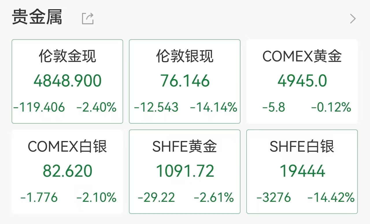 Core Viewpoint - The recent sharp decline in gold and silver prices is attributed to a combination of reduced geopolitical tensions and resilient U.S. economic data, which has diminished safe-haven demand [1] Group 1: Market Performance - As of the latest report, spot gold has dropped by 2.4% to $4848.9 per ounce, previously falling over 3.6% below $4800 per ounce; spot silver has decreased by 14.14% to $76.146 per ounce, having plummeted over 17% below $74 per ounce [1] - Last Friday marked the beginning of a significant downturn, with silver prices crashing by 26%, the largest drop in history, while gold fell by 9%, representing the worst single-day performance in nearly a decade [1] Group 2: Economic Indicators - Upcoming U.S. economic data to watch includes JOLTS job openings and initial jobless claims for the week ending January 31 [1] - The strengthening U.S. dollar and stable U.S. Treasury yields have also contributed to the downward pressure on gold prices [1] Group 3: Influential Factors - The nomination of Kevin Warsh as the next Federal Reserve Chairman by Trump has been identified as a catalyst for market panic, as Warsh is known for his hawkish stance on inflation and support for quicker interest rate cuts [1] - Warsh's views on excessive quantitative easing and support for balance sheet reduction may influence the narrative around de-dollarization and fiat currency proliferation [1] Group 4: Historical Context - Historical analysis indicates that significant price increases in gold typically require around six months to digest, with the current rapid price increases leading to a necessary correction to alleviate overbought conditions [2] - The report highlights that gold experienced 55 record highs in the previous year and surged over 20% in less than a month at the start of this year, indicating an unsustainable rate of increase [2]