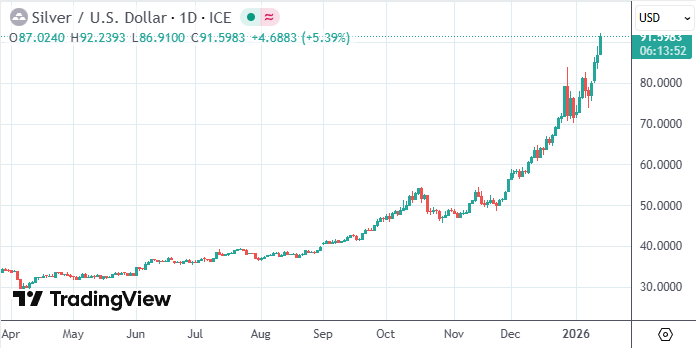 现货白银狂飙破92美元刷新高,美联储独立性动摇点燃行情