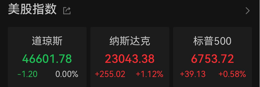 来源:中国证券报-中证网 当地时间10月8日(周三),美股三大股指收盘涨跌不一,道指微跌,纳指与标普500指数再创历史新高。纳指首次收 于23000点上方。美联储9月货币政策会议纪要显示,美联储内部在后续降息幅度上存在分歧。 此外,现货黄金盘中价格触及4050美元/盎司,再创历史新高。 纳指与标普500再创新高 Wind数据显示,当地时间10月8日,美股三大股指涨跌不一。截至收盘,道指微跌,报46601.78点;标普500指数涨 0.58%报6753.72点,纳指涨1.12%报23043.38点。其中,标普500指数、纳指创收盘新高。 大型科技股多数上涨,万得美国科技七巨头指数上涨0.84%。个股方面,英伟达涨超2%,亚马逊、特斯拉涨逾1%。 | 済版 成分 | 相关基金 | 资讯 | 月度收益 | | | --- | --- | --- | --- | --- | | 名称 | | 现价 | 涨跌幅 ◆ | lil | | 英伟达(NVIDIA) | | 189.110 | 2.20% | | | NVDA.O | | | | | | 亚马逊(AMAZON) | | 225.220 | 1.55% | | ...