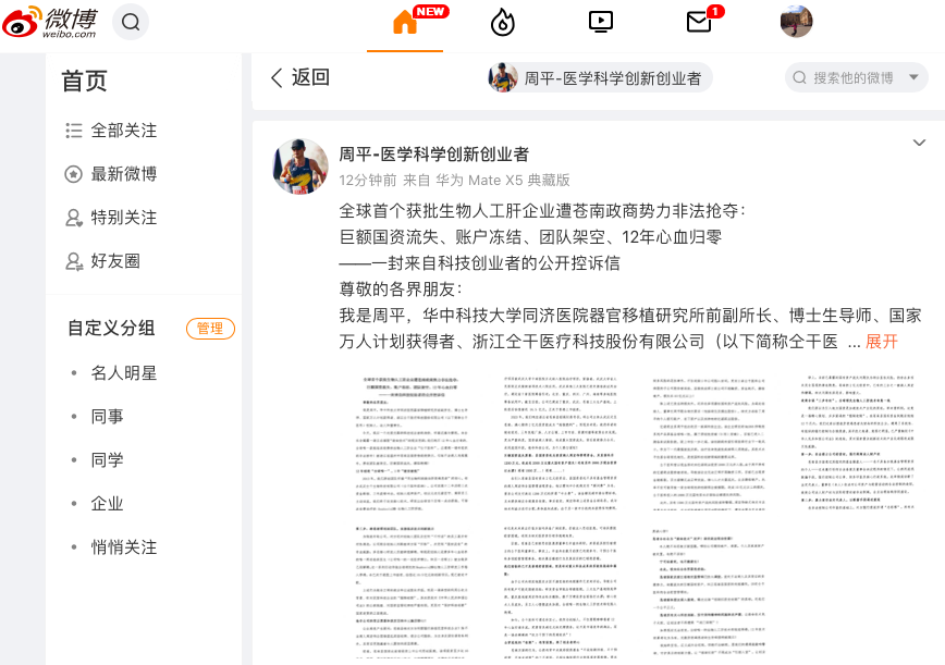 "严重失实,涉及造谣" 投资"九死一生"的科创企业,国资基金如何在耐心资本与投资回报之间找到平衡? 12月26日下午,华中科技大学同济医院器官移植研究所前副所长、浙江仝干医疗科技股份有限公司(下称"仝干医科")创 始人及董事长周平在社交媒体上发布一封公开控诉信,直指科技创业者耗尽12年心血打造的、全球唯一获批临床收费的生 物人工肝企业,正被浙江省温州市苍南县国资违规强夺,导致仝干医科三大基地生产停滞,数千万建设资金打水漂,创始 大股东被逼出局。 对此,苍南公共事业投资集团董事长叶青健26日晚间在接受第一财经记者采访时称,周平微博我方已关注到,此微博(内 容)严重失实,涉及造谣。 孔雀东南飞"折翅" 公开资料显示,周平从事器官移植及普通外科临床有30多年。早在1997年,周平就在美国参与生物人工肝的早期研发, 2006年起与日本冈山大学医院联合研发永生化人源肝细胞生物人工肝,2010年自主研发了HepAssis2生物人工肝系统。 2013年,周平在武汉成立仝干医科,开始了HepAssis2生物人工肝系统的产业化。从2015年开始,仝干医科先后获得四轮融 资。 2023年7月,苍南县政府及国资11人团队赴武汉考察 ...