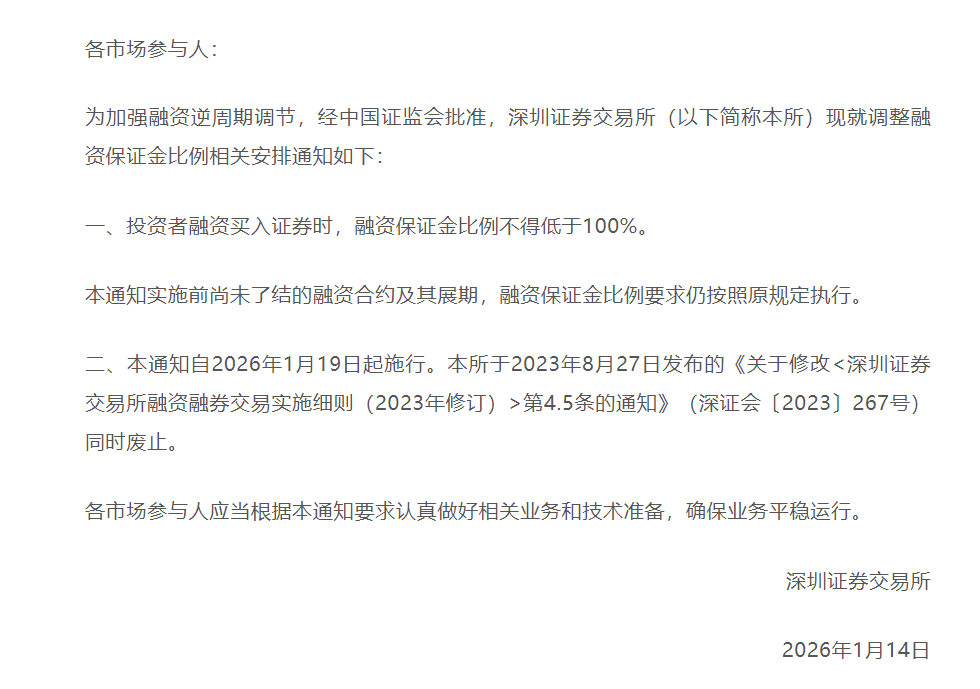 2026年1月14日,经中国证监会批准,沪深北交易所发布通知调整融资保证金比例,将投资者融资买入证券时的融资保证金最低比例从80%提高至 100%。 2023年8月,沪深北交易所将融资保证金比例从100%降低至80%,融资规模和交易额稳步上升。近期,融资交易明显活跃,市场流动性相对充裕,根 据法定的逆周期调节安排,适度提高融资保证金比例回归100%,有助于适当降低杠杆水平,切实保护投资者合法权益,促进市场长期稳定健康发 展。 需要说明的是,此次调整仅限于新开融资合约,调整实施前已存续的融资合约及其展期仍按照调整前的相关规定执行。 来源:人民财讯 责编:彭勃 ...