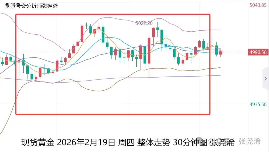 张尧浠:地缘局势风险难稳、金价震荡调整仍待走强 上交易日周四(2月19日):国际黄金震荡收涨,其日内受到美伊紧张局势持续,获得反弹动力,但近日美元指数的走强和初请等数据的好于预期及前值, 限制了其多头,虽仍未重返中轨上方,但其走势预期上,暗示后市仍具有向上攀升的倾向,下方30日或60日均线等支撑,仍是逢低看涨的位置。 具体走势上,金价自亚市开于4977.09美/盎司,先行录得日内低点4959.36美元,之后日内连续过山车震荡走盘为主,于美盘时段微幅刷新欧盘初高点触及 5022.08美元,最终维持在震荡区间内,遇阻回撤收于4996.35美元,日振幅62.72美元,收涨19.26美元,涨幅0.39%。 技术上,月线级别,金价2月在延续1月份的倒垂看空再度跳水后,触及年初突破的上升趋势阻力转的支撑后,止跌反弹回升,维持在新牛市空间内,同时 也处于5月均线上方,暗示1月份的看空回落依然出尽,新的牛市看涨前景仍然有效,后市也将保持在此趋势支撑上方再度走强攀升,但目前多头动力减 弱,故此,后市也或将震荡调整后再度走强攀升。 日图,金价目前持续震荡调整,短期上有中轨压力,下方有30日均线支撑,方向不明,但从更长远来看,鉴于 ...