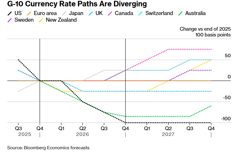 Group 1 - The core viewpoint of the articles highlights the divergence in global central bank monetary policies due to the influence of U.S. President Trump's administration and its impact on economic uncertainty and market volatility [1][5][8] - Bloomberg Economics predicts that the monetary policy paths of major economies will become increasingly diverse over the next two years, moving away from the synchronized approach seen in recent years [4][8] - The "Trump variable" is identified as a significant factor affecting global central bank policy decisions, particularly regarding interest rate expectations and the independence of the Federal Reserve [5][9] Group 2 - The articles indicate that the Federal Reserve's monetary policy may be more flexible than previously anticipated, with expectations of potential rate cuts in 2026 exceeding market predictions [11][12] - Other major central banks, such as those in Canada, Japan, and Switzerland, are expected to announce continued rate hikes, while the Eurozone may maintain its current policy rates [11][12] - Emerging market countries, including Brazil and Nigeria, are anticipated to implement significant rate cuts, further contributing to the divergence in global monetary policy [11][12]