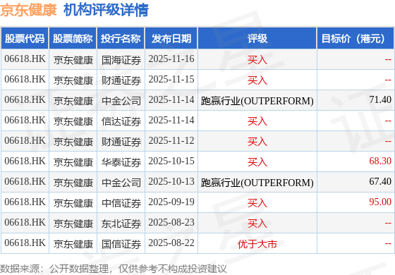 Core Viewpoint - JD Health (06618.HK) is expected to see strong revenue and profit growth in Q3 2025, driven by the expansion of insurance payment coverage, offline service development, and deepening AI medical applications, solidifying its leading position in the pharmaceutical e-commerce sector. The company has a positive growth outlook, with a "Buy" rating from multiple investment banks [1]. Group 1: Company Performance - JD Health's market capitalization is HKD 220.101 billion, ranking first in the healthcare services sector [1]. - The company reported a revenue of HKD 65.106 billion, significantly higher than the industry average of HKD 3.832 billion, also ranking first in this metric [2]. - JD Health's net profit margin stands at 7.34%, while the industry average is at -843.36%, placing it 23rd in the industry ranking [2]. Group 2: Investment Ratings - In the past 90 days, seven investment banks have issued "Buy" ratings for JD Health, with a target average price of HKD 75.53 [1]. - The latest ratings from various investment banks include: - Guohai Securities: Buy [1] - Caitong Securities: Buy [1] - Zhonghui Company: Outperform with a target price of HKD 71.40 [1] - Xinda Securities: Buy [1] - Huatai Securities: Buy with a target price of HKD 68.30 [1] - Zhongquan Company: Outperform with a target price of HKD 67.40 [1] - CITIC Securities: Buy with a target price of HKD 95.00 [1]