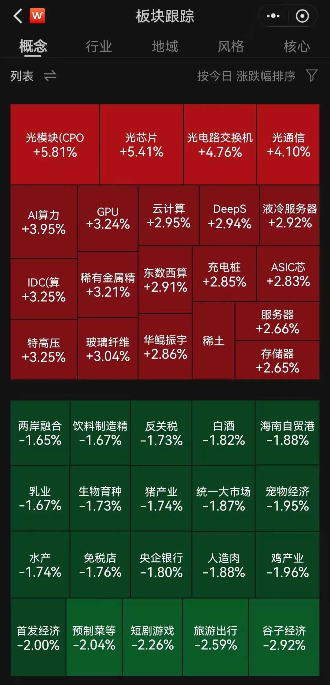 每经记者|杜波 每经编辑|陈柯名 记者|杜波 编辑|陈柯名 杜恒峰 校对|程鹏 2月12日A股收盘,主要指数集体收涨。沪指上涨0.05%,深成指上涨0.86%,创业板指上涨1.32%,科创综指上涨1.56%。总成交额2.16万亿元,较上一个 交易日放量1597亿元。 全市场超3200只个股下跌,超2100只个股上涨。盘面上,CPO概念大涨,太辰光、天孚通信、协创数据等多股涨超10%;电网设备概念走强,汉缆股份、 四方股份、望变电气等多股涨停;半导体板块拉升,芯原股份等大涨;影视院线板块延续回调,横店影视、博纳影业跌停。此外,通信设备、小金属、汽 车芯片、抽水储能、消费电子等概念涨幅居前,零售、白酒、乳业、预制菜、免税店等板块跌幅居前。 | < W | | 板块眼踪 | | 1 ( . | | --- | --- | --- | --- | --- | | 概念 | 行业 | 地域 | 风格 | 核心 | | 列表 ⇌ | | | 按今日 涨跌幅排序 | | | 光模块(CPO +5.81% | | 光芯片 +5.41% | 光电路交换机 +4.76% | 光通信 +4.10% | | AI算力 +3.95% ...