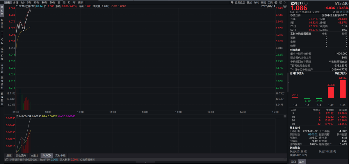 Group 1 - The core viewpoint of the news highlights the significant surge in the A-share software sector, with the Software 50 ETF (159590) experiencing a rise of over 5% and attracting more than 270 million yuan in investments over two days [1][4] - On January 13, a government action plan was released to promote the high-quality development of industrial internet platforms, aiming to cultivate over 450 influential platforms and achieve over 120 million industrial device connections by 2028, with a platform penetration rate exceeding 55% [3] - Major components of the Software 50 ETF saw substantial gains, including a rise of over 8% for Yonyou Network, over 7% for Tonghuashun and Zhongke Xingtu, and over 6% for 360 [4][5] Group 2 - The AI industry is experiencing a continuous increase in popularity, with significant advancements in capital, application, and technology. Notably, two leading general model companies, Zhipu and MiniMax, successfully listed on the Hong Kong Stock Exchange, reflecting strong market recognition for the AI sector [6] - The integration of AI into various fields is accelerating, with AI for Science emerging as a new research paradigm and the rise of Generative Engine Optimization (GEO) emphasizing high-quality content in model outputs [6] - Securities firms predict that 2026 will be a pivotal year for AI applications, driven by continuous improvements in model capabilities, decreasing computing costs, and accelerated monetization processes [7]