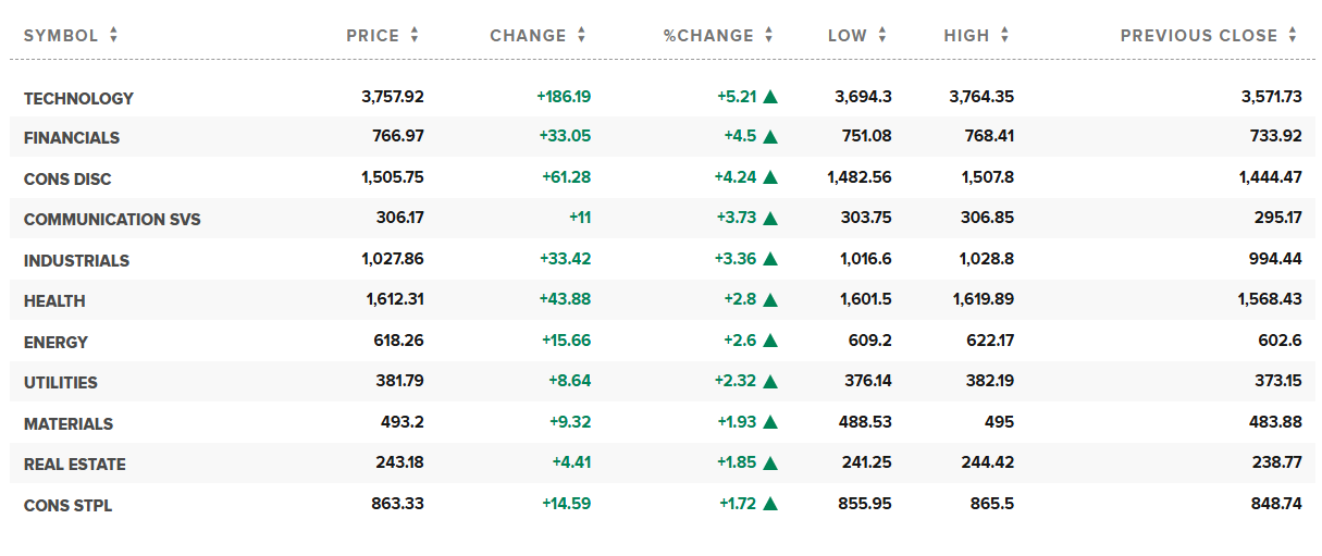 标普500指数上涨4%,创2022年11月以来最大盘中涨幅,科技板块涨5.2%,金融和可选消费板块至少涨超4.2%,电信板块涨3.7%。 | SYMBOL $ | PRICE $ | CHANGE $ | %CHANGE $ | LOW ÷ | HIGH # | PREVIOI | | --- | --- | --- | --- | --- | --- | --- | | TECHNOLOGY | 3,757.92 | +186.19 | +5.21 ▲ | 3,694.3 | 3,764.35 | | | FINANCIALS | 766.97 | +33.05 | +4.5 A | 751.08 | 768.41 | | | CONS DISC | 1,505.75 | +61.28 | +4.24 ▲ | 1,482.56 | 1,507.8 | | | COMMUNICATION SVS | 306.17 | +11 | +3.73 A | 303.75 | 306.85 | | | INDUSTRIALS | 1,027.86 | +33.42 | +3.36 | 1,016.6 | 1,028.8 ...