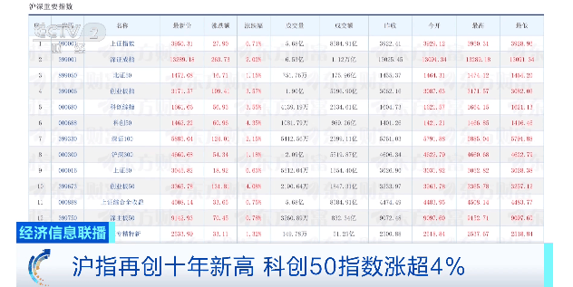 (央视财经《经济信息联播》)今天(10月24日),A股主要股指全线收红,其中上证指数创下十年新 高,科技股再度领涨,半导体重返强势。 中泰证券研究所资深策略分析师 张文宇 :展望后市,伴随着政策的密集发布,比如说"十五五"规划的 具体细节,包括对于科技自立自强的表述更加明显,科技(板块)反弹它有一定惯性。但是我们也要注 意到整个科技板块从8月份以来也积累了不少涨幅。 | 角球面试测图 | | | | | | | | | | | | | | --- | --- | --- | --- | --- | --- | --- | --- | --- | --- | --- | --- | --- | | සිද | 1 | 2 | 标持 | 最复出 | 机点额 | 家族服 | 成交量 | G交换 | 150 | 今川 | 景在 | 長永 | | | 202007 | | 上任指数 | 3561, 31 | 27, 95 | 0.71% | 5.68亿 | 316 '818 | 3922. 41 | 3529, 12 | 1910 31 | 3928. 91 | | 20 | 597001 | | 深证成指 | 132 ...