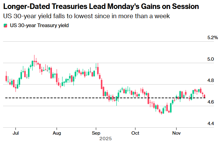 智通财经APP获悉,美国国债价格连续第三天上涨,原因是交易员们在根据美联储官员的鸽派言论重新 调整对下月降息的预期。美联储官员的鸽派发言使得几乎所有期限的债券收益率均有所下降,其中 10 年期美国国债的收益率降幅高达 3 个基点,降至 4.03%,为本月的最低水平。而对货币政策变化更为敏 感的2年期美国国债的收益率则因本周的拍卖而受到抑制。 投资者的关注点仍集中在美联储 12 月 10 日的决策上。此前,纽约联储主席威廉姆斯上周表示,他认为 在"短期内"还有进一步降息的空间。美联储理事沃勒周一与威廉姆斯意见一致,主张在 12 月进行降 息,随后从 2026 年起采取更为灵活的政策。据报道,旧金山联储主席戴利也表示支持降低利率。 Natalliance Securities副主席Andrew Brenner周一写道:"投资者们感到欣慰的是,美联储的高层成员仍希 望在 12 月采取宽松政策,尽管就业数据要到美联储会议结束后才会公布。" 在外汇市场中进行隔夜指数掉期交易的交易员们预计,美联储官员下个月将把政策利率下调 25个基点 的可能性约为 80%,这一比例较一周前的 40%有所上升。不过,鉴于 10 月和 11 ...