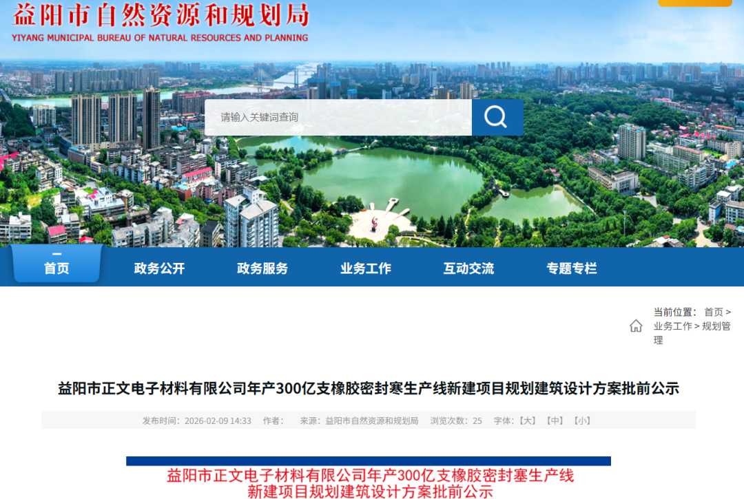 Core Viewpoint - The project for the annual production of 30 billion rubber sealing plugs by Yiyang Zhengwen Electronic Materials Co., Ltd. has received preliminary approval for its architectural design plan, indicating a significant expansion in production capacity and product quality improvement [3][9]. Group 1: Project Overview - The project is located in Yiyang, Hunan Province, covering a total land area of 12,983.87 square meters [1][6]. - The planned investment for the project is 50 million yuan, with a construction area of 1,500 square meters [3][9]. - Upon completion, the project will enable the production of 30 billion rubber sealing plugs annually, a substantial increase from the previous capacity of 3 billion plugs [3][9]. Group 2: Production Details - The new production line will focus on producing sealing plugs in various sizes, with 95% of the output being 4mm to 6mm plugs and 5% being 10mm to 30mm plugs [3][9]. - The annual consumption of butyl rubber and ethylene propylene rubber is expected to increase from 300 tons to 900 tons, with carbon black consumption at 200 tons [3][9]. Group 3: Company Background - Yiyang Zhengwen Electronic Materials Co., Ltd. was established in 2013 with a registered capital of 1.08 million yuan, specializing in the processing and sales of aluminum electrolytic capacitors and rubber sealing plugs [6][12]. - The company holds multiple patents in the production of rubber sealing plugs, including technologies for rapid cutting, metal feeding devices, burr cleaning devices, and polishing devices [6][12].