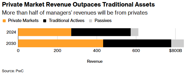 普华永道英国全球资产与财富管理主管阿尔伯莎.查尔斯周一在一份报告中表示:"赢家不会是那些积累 最多资产的人,而是那些能最快完成转型的人。"该报告调查了300家全球公司和投资者。 根据普华永道的报告,到2030年,私募市场将产生财富管理行业一半以上的收入,这一增长反映了各公 司在私募债务、股权和基础设施领域扩张的竞争日益激烈。 私募市场收入增速超过传统资产 资产管理行业还面临着传统股票、债券、货币市场和多资产基金费用持续承压的局面。普华永道调查的 机构投资者中,近60%表示他们"可能"或"非常可能"仅因成本原因更换管理方。因此,尽管成本居高不 下,但主动和被动策略的管理费预计都将下降。 这家咨询公司发现,到2030年,资产和财富管理行业将从私募资产中获得约4320亿美元的收入,超过传 统主动管理投资和被动产品的收入总和。普华永道的数据显示,2024年,私募资产占总收入的44%,而 传统投资构成了行业总收入的大部分。 尽管如此,私募市场已变得越来越拥挤。许多传统基金公司——包括富兰克林资源公司、景顺公司和道 富银行——最近收购了私募市场公司或与之合作,以站稳脚跟。 自2024年初以来,贝莱德已花费超过250亿美元 ...