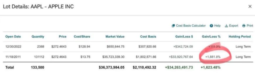 来源:市场资讯 (来源:都市现场) 红星资本局1月3日消息,知名投资人段永平在投资交流平台雪球上,以"大道无形我有型"的ID发文晒出 部分持仓。图片显示,该账号于2011年11月开始买入苹果(AAPL.US)股票,累计收益率达 1623.48%,目前收益金额约为3426万美元。 | | Lot Details: AAPL - APPLE INC | | | | | | | × | | --- | --- | --- | --- | --- | --- | --- | --- | --- | | | | | | | | | Cost Basis Calculator @ Help & Export | @ Print | | Open Date | Quantity | Price | Cost/Share | Market Value | Cost Basis | Gain/Loss $ | Gain/Loss % | Holding Period | | 12/30/2022 | 2388 | $272,4643 | $128.94 | $650,644,75 | $307,920,66 | +$342,7 ...
