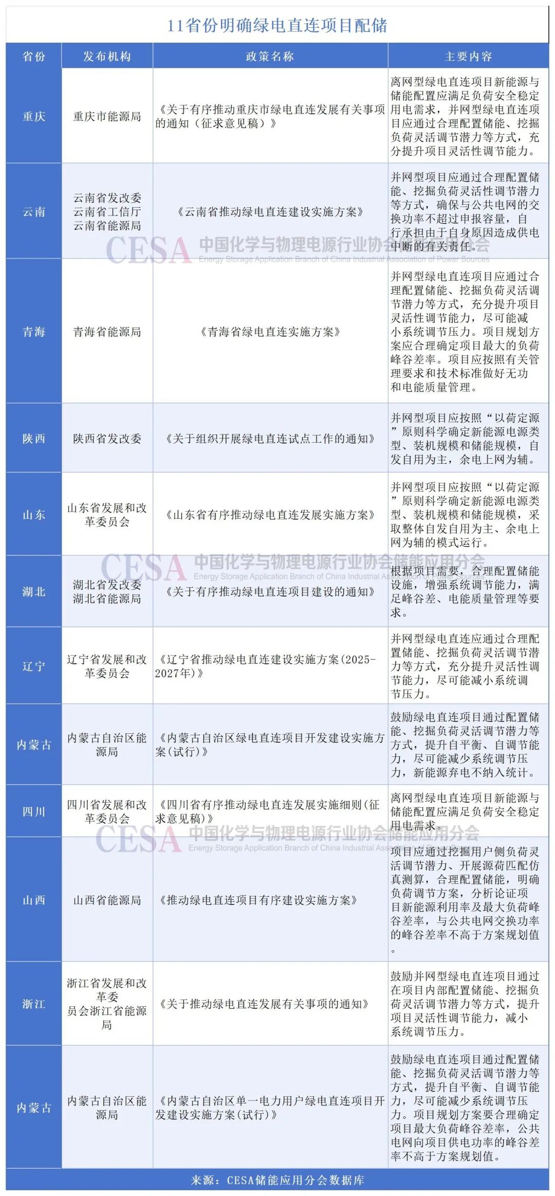 (来源:储能网) 这是自2025年5月绿电直连上升为国家层面战略后,第11个地方省份明确绿电直连项目配储。 | 省份 | 发布机构 | 政策名称 | 主要内容 | | --- | --- | --- | --- | | | | | 离网型绿电直连项目新能源与 储能配置应满足负荷安全稳定 | | 重庆 | 車庆市能源局 | 《关于有序推动重庆市绿电直连发展有关事项 用电需求,并网型绿电直连项 | | | | | 的通知(征求意见稿)》 | 目应通过合理配置储能、挖掘 | | | | | 负荷灵活调节潜力等方式,充 分提升项目灵活性调节能力。 | | | | | 并网型项目应通过合理配置储 | | | | | 能、挖掘负荷灵活性调节潜力 | | | △南省发改委 | | | | 石南 | 云南省工信厅 | 《云南省推动绿电直连建设实施方案》 | 等方式,确保与公共电网的交 | | | 云南省能源局 | | 换功率不超过申报容量,自 | | | | | 行承担由于自身原因造成供电 | | | | 中国化学与物理电源行业 中断的有关责任。 Energy Storage Application Branch of Ch ...