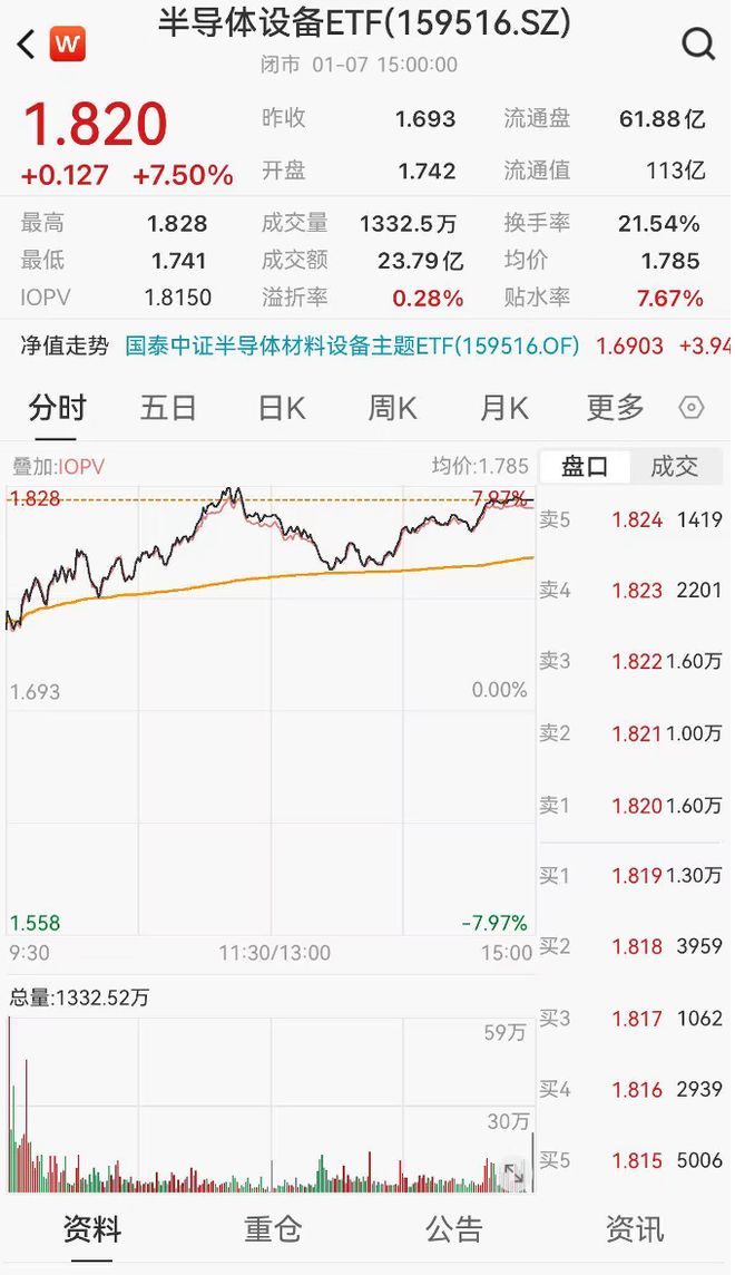 来源:WIND 半导体设备ETF(159516)又双叒强势,三连阳再创新高。消息面上,商务部发布2026年第1号关于加 强两用物项对日本出口管制的公告;近期中日摩擦加大,国产替代逻辑加强; CES大会上,英伟达宣 布在网络体系增加一个独立的高速"记忆层",存储需求大幅增长;1月6日夜盘美股存储强势。1月7日半 导体设备继续强势,收盘大涨7.50%。 | 半导体设备ETF(159516.SZ) | | | | | | | --- | --- | --- | --- | --- | --- | | 闭市 01-07 15:00:00 | | | | | | | 1.820 | | 昨收 | 1.693 | 流通盘 | 61.88亿 | | +0.127 +7.50% | | 开盘 | 1.742 | 流通值 | 113亿 | | 最高 | 1.828 | 成交量 | 1332.5万 | 换手率 | 21.54% | | 最低 | 1.741 | 成交额 | 23.79亿 | 均价 | 1.785 | | IOPV | 1.8150 | 溢折率 | 0.28% | 贴水率 | 7.67% | | 净值走势 国泰中证 ...