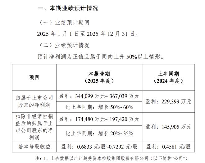 越秀资本:预计2025年度归母净利润34.41亿元至36.7亿元,增长50%至60%