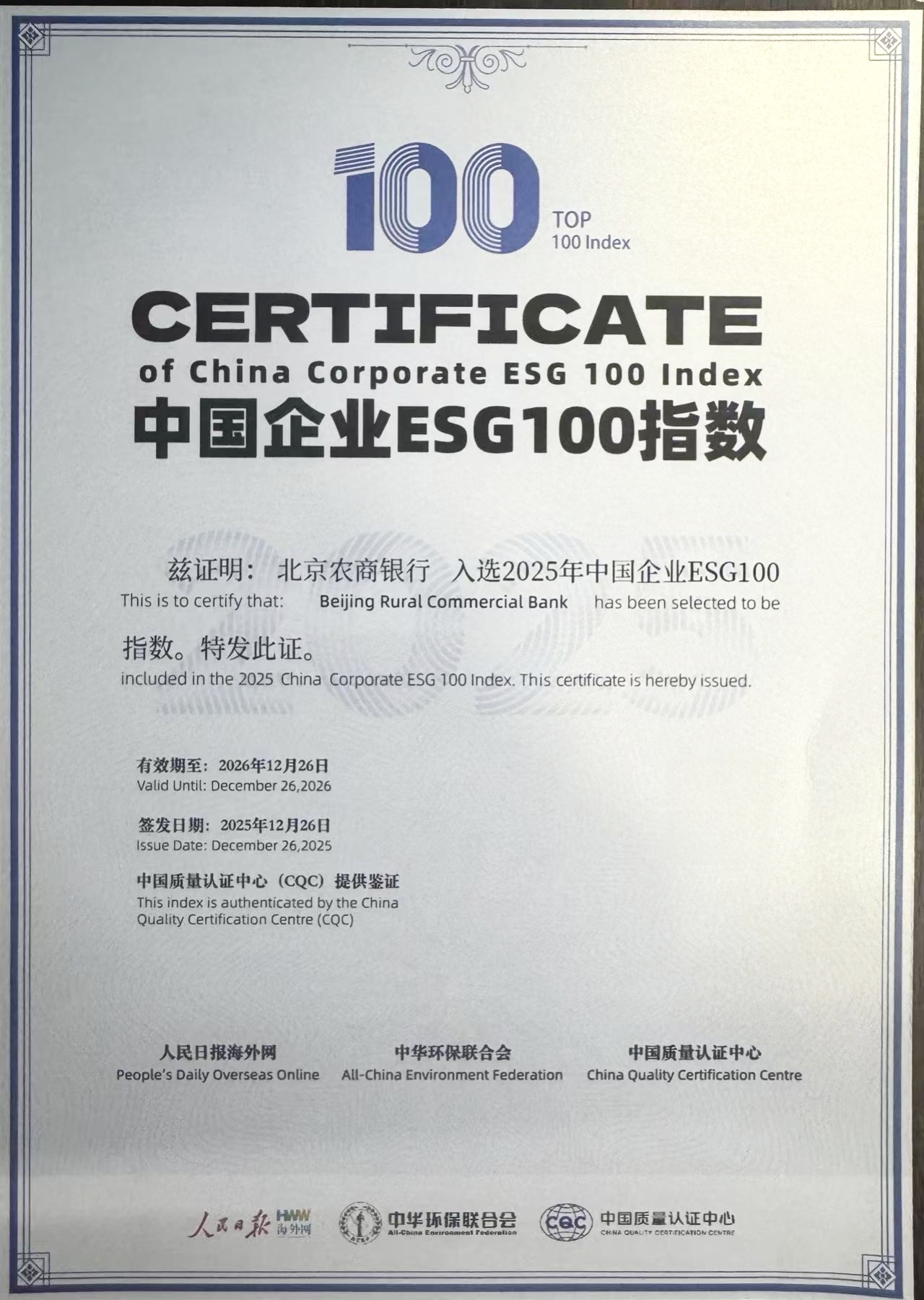 连续两年登榜!北京农商银行成功入选 “2025中国企业ESG100指数”榜
