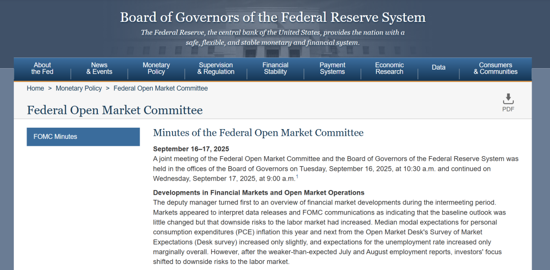 美联储会议纪要显示,即使官员降息,仍对通胀保持谨慎 中国基金报记者 泰勒 大家好,关注一下美联储的重磅消息。 10月9日凌晨, 美联储公布9月联邦公开市场委员会(FOMC)会议纪要。美联储官员们在9月政策会议上表现出今年进一步降息的意愿,但同时也因通胀 风险而保持谨慎。 重点内容如下。 尽管决策者指出劳动力市场的风险有所上升,许多人也认为就业不太可能迅速恶化。 纪要称:"与会者总体评估,近期指标并未显示劳动力市场状况出现急剧恶化。" 自9月会议以来,包括美联储副主席菲利普·杰斐逊和米歇尔·鲍曼在内的美联储理事都提到,劳动力市场的强劲是需要降息的理由。米兰则认为,中性利率 低于普遍认知,这意味着美联储需要更快降息。特朗普及多名政府官员也引用近期数据,越来越多地呼吁美联储立即降息。 联邦基金利率期货显示,投资者预计10月和12月大概率会降息。 纪要写道:"几乎所有接受纽约联储交易台调查的受访者都预计本次会议将把联邦基金利率目标区间下调25个基点,约半数受访者预计10月会议还将进一 步降息。绝大多数受访者预计到年底至少会有两次25个基点的降息,约半数预计会有三次。" 美联储官员在上月的政策会议上表示,今年内有意进一 ...