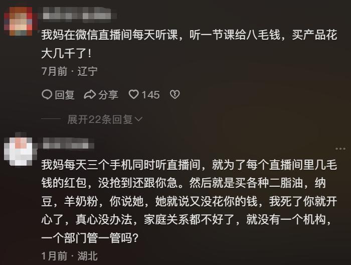 01:"中老年大学习" 大伙儿常说,一代人有一代人的鸡蛋要领。 现在看来,这都算低估了时局的严峻程度,因为,爱领鸡蛋的那辈人,又有"新鸡蛋"可以领了...... 在过去一整年内,越来越多的网友发现自家爸妈开始迷上了"听网课"。 听网课,被撒网 每天雷打不动地掏出手机听讲座,不仅会认真记笔记,写感悟,还会按时上交自己的"课后作业"。 起初大伙还在感慨互联网改变生活,爸妈终于不再痴迷于刷短视频了,上上"老年网络大学"也挺好。 结果,这些所谓"网课讲座"听了个把月后,家中逐渐堆砌起了一箱箱的"保健品",那时才发现大事不妙。 认真听课,激情消费 这种现象背后绕不开一个新词儿——"私域直播"。 首先,私域直播与私域经济等概念密切相关,"私域经济"近年来被多次提及,相比于公域流量,其目标受众更加垂直,变现也更迅速,该特性吸引了不少 人入局,其中就包括盯上中老年人群的骗子。 相较于抖音快手等公域平台,私域直播通常借助微信群、企业微信、小程序等途径来完成对私域流量的营销。 这就意味着,比起直播监管相对严格的公域平台,私域直播能够更加隐蔽、灵活、无痕的进行。 通常而言,这些私域直播会选用微信群作为核心组织形式,每日在群内发布特 ...