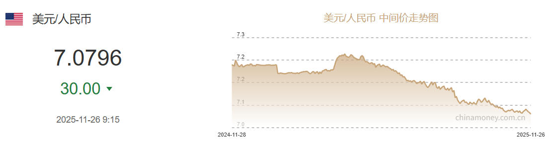 广告等商务合作,请点击这里 本文为转载内容,授权事宜请联系原著作权人 图源:中国外汇交易中心网站截图 来源:中国新闻网 编辑:熊思怡 11月26日人民币对美元中间价报7.0796元 上调30个基点 中新网11月26日电 据中国外汇交易中心网站消息,中国人民银行授权中国外汇交易中心公布,2025年11月26日银行间外汇市场人民币汇率中间价为:1美元 对人民币7.0796元,上调30个基点。 中新经纬版权所有,未经书面授权,任何单位及个人不得转载、摘编或以其它方式使用。 关注中新经纬微信公众号(微信搜索"中新经纬"或"jwview"),看更多精彩财经资讯。 ...