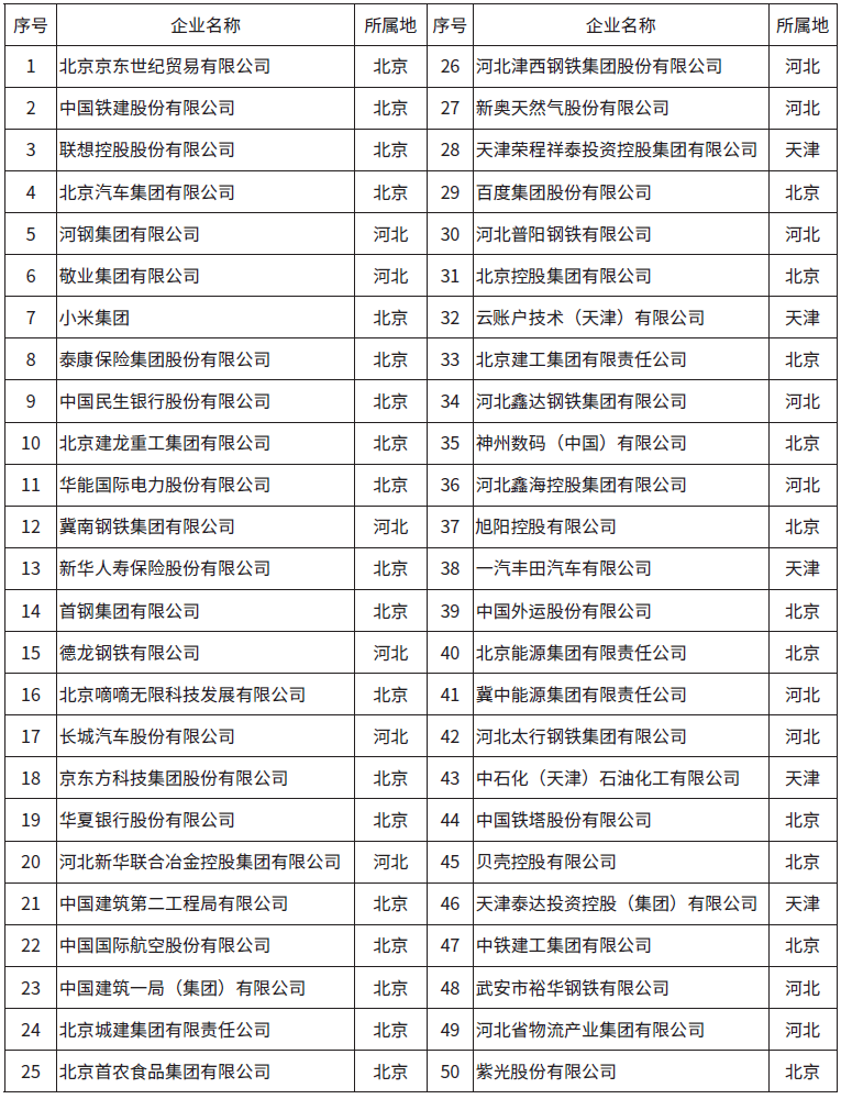 11月13日,由京津冀三地企业联合会、企业家协会联合举办的京津冀产业链供应链创新发展峰会暨百强企业高质量发展大会在石家庄召开。会上发布了 2025京津冀企业200强榜单,河北66家企业入选。河北入围企业前三名是河钢集团有限公司、敬业集团有限公司、冀南钢铁集团有限公司,分别居2025京 津冀企业200强榜单第5位、6位、12位。 2025京津冀企业百强名单 | 序号 | 企业名称 | 所属地 | 序号 | 企业名称 | 所属地 | | --- | --- | --- | --- | --- | --- | | 159 | 三一重能股份有限公司 | 北京 | 180 | 北京顺丰速运有限公司 | 北京 | | 160 | 中煤化(天津)化工销售有限公司 | 天津 | 181 | 北京时尚控股有限责任公司 | 北京 | | 161 | 中国能源建设集团天津电力建设有限公司 | 天津 | 182 | 天津现代集团有限公司 | 天津 | | 162 | 天津市医药集团有限公司 | 天津 | 183 | 北京路通企业管理集团有限公司 | 北京 | | 163 | 天津拓径贸易有限公司 | 天津 | 184 | 唐山银行股 ...