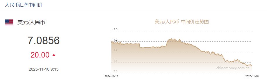 中国人民银行授权中国外汇交易中心公布,2025年11月11日银行间外汇市场人民币汇率中间价为: 1美元对人民币7.0866元,1欧元对人民币8.1986元,100日元对人民币4.6064元,1港元对人民币0.91160 元,1英镑对人民币9.3465元,1澳大利亚元对人民币4.6371元,1新西兰元对人民币4.0101元,1新加坡 元对人民币5.4468元,1瑞士法郎对人民币8.8091元,1加拿大元对人民币5.0607元,人民币1元对1.1307 澳门元,人民币1元对0.58597马来西亚林吉特,人民币1元对11.4209俄罗斯卢布,人民币1元对2.4187南 非兰特,人民币1元对205.22韩元,人民币1元对0.51741阿联酋迪拉姆,人民币1元对0.52839沙特里亚 尔,人民币1元对46.7518匈牙利福林,人民币1元对0.51613波兰兹罗提,人民币1元对0.9109丹麦克朗, 人民币1元对1.3408瑞典克朗,人民币1元对1.4273挪威克朗,人民币1元对5.94738土耳其里拉,人民币1 元对2.5908墨西哥比索,人民币1元对4.5511泰铢。 中国经济网北京11月11日讯 今日,人民币对美元 ...