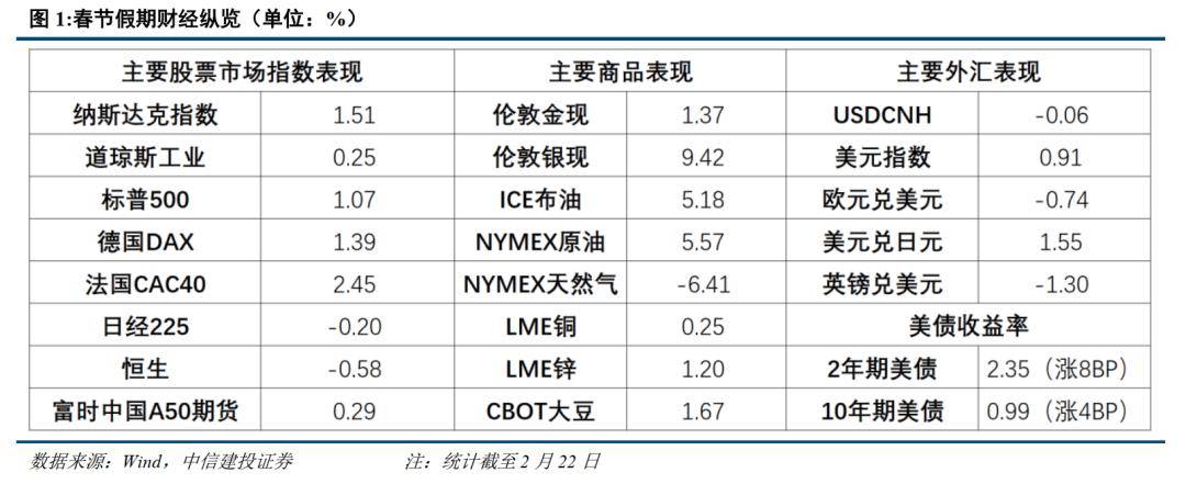 来源|中信建投证券 文|夏凡捷 春节期间全球股市整体强势,无重大风险事件,当前市场情绪仍然高涨,节后A股有望开启新一轮上行。行业配置上继续坚持"科技+资源品"双主线。其 中科技主线以AI、人形机器人、新能源和创新药为核心,资源品主线以贵金属、石油石化、基础化工为核心。重点关注板块包括:半导体、AI(光通 信、液冷、电子布、高端铜箔等)、机械、有色、石油石化、基础化工、电力设备(储能、特高压、光伏、固态电池等)、创新药等。 春节假期全球市场动态 春节假期期间全球主要股指多数上涨,新兴市场与发达市场表现分化,韩国综合指数涨幅居首,欧洲三大股指同步走高,美股温和上涨,而日本、中国香 港等亚太市场表现较弱。主要商品价格多数上涨,伊朗局势推动国际油价持续走强,也同样推动了贵金属和美元指数的上行。工业金属中铜价保持高位震 荡,锌、铅价格相对平稳。 美国最高法院裁决叫停"对等关税",特朗普随即宣布加征15%"全球进口关税"。特朗普关税的后续影响主要来自未来数月巨大的不确定性,这可能继续导 致美元指数维持阶段性强势,同时推升贵金属价格。不确定性主要包括:关税退款、替代关税如何设计、第二轮会影响哪些行业。 另外,美伊谈判一波三 ...